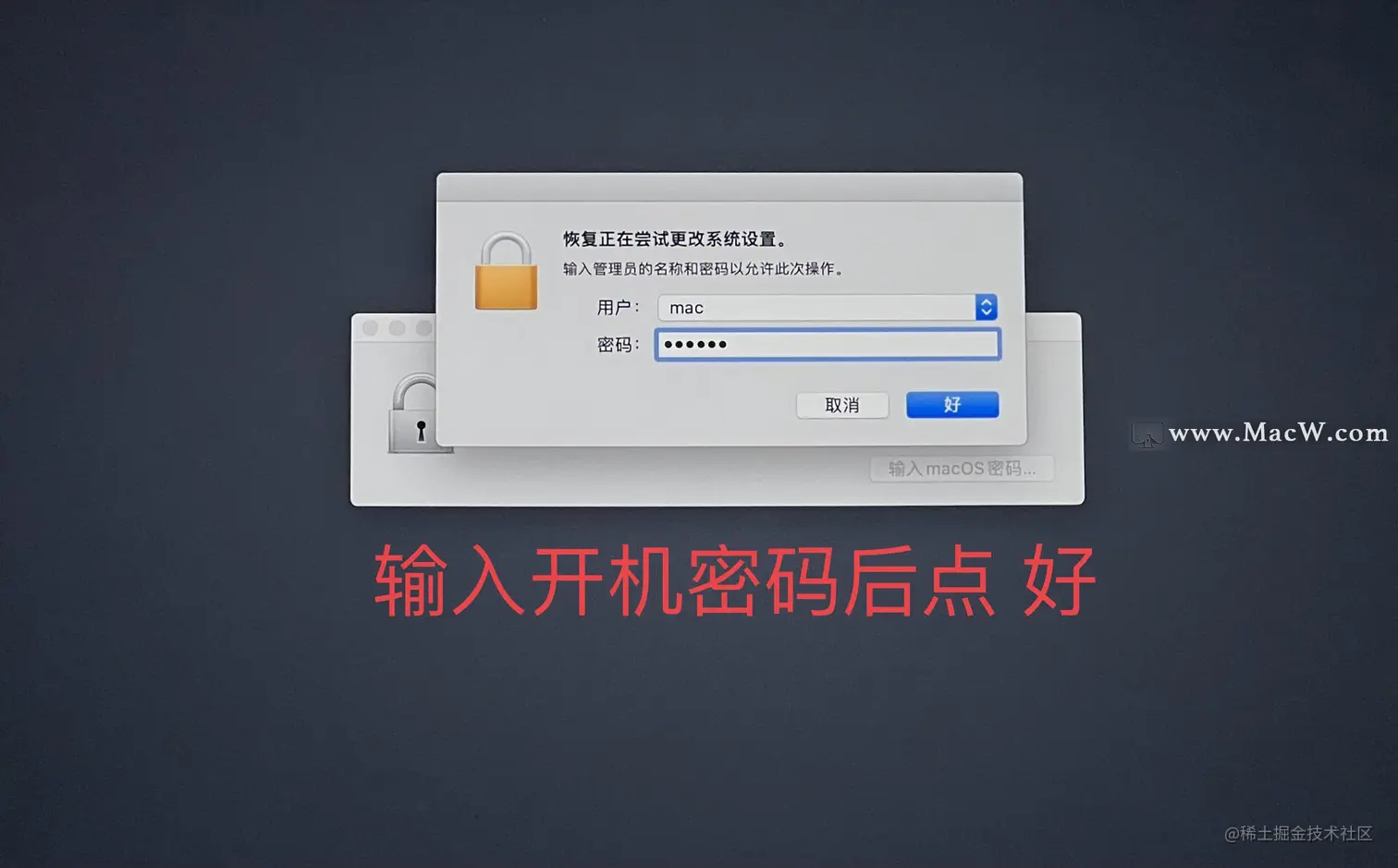 - 输入MacOS密码,这个密码就是 你电脑的 开机密码