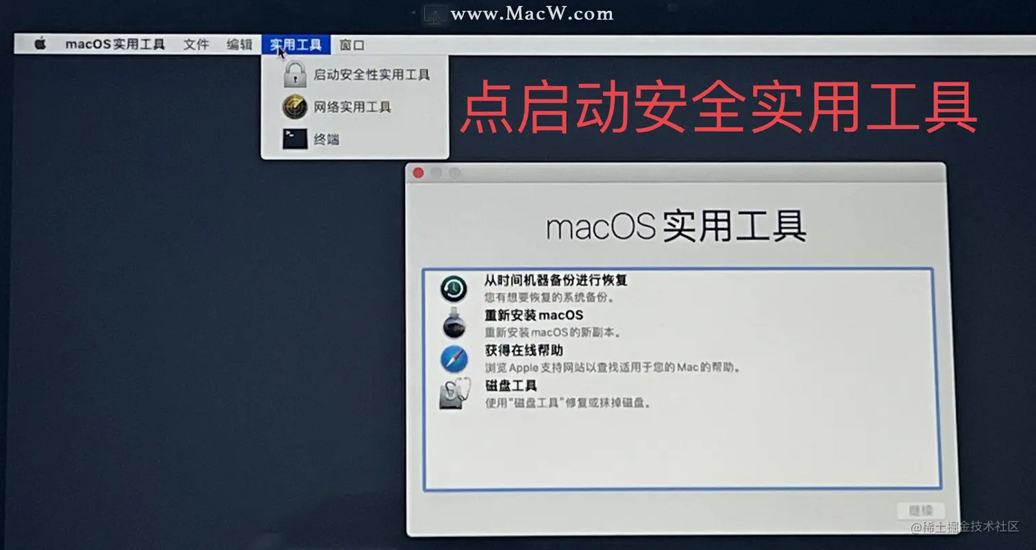 - 然后回弹出下面的提示:这也是T2芯片独有的提示,按照要求来做,我们点击 重新启动 同时按住 command 和 R