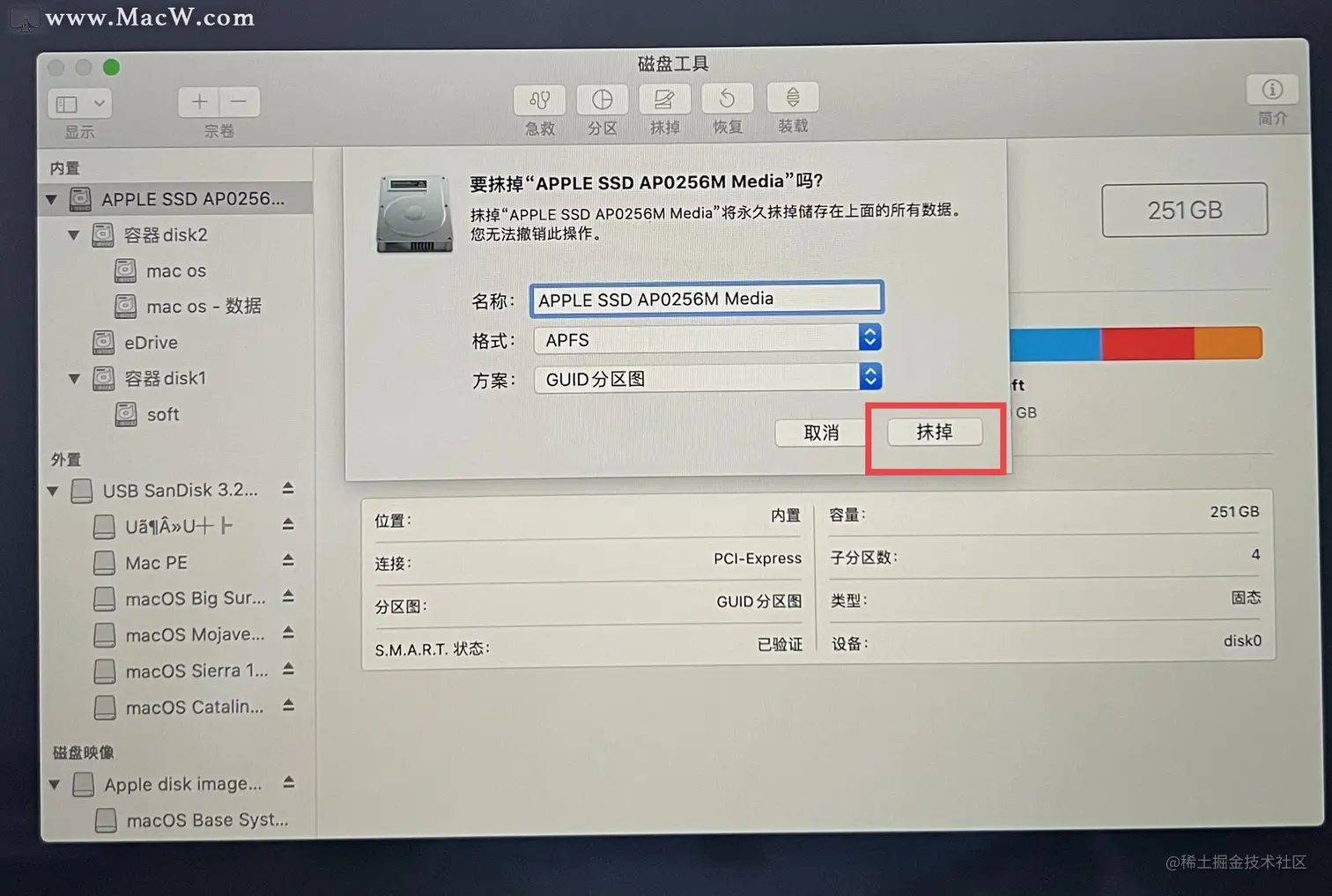 - 下图中,如果你的电脑想安装10.14系统或者匹配的更低版本,格式 则需要选择 macos 扩展日志式,一般来说T2芯片的出厂系统应该都是APFS,你选择APFS都是没问题的。