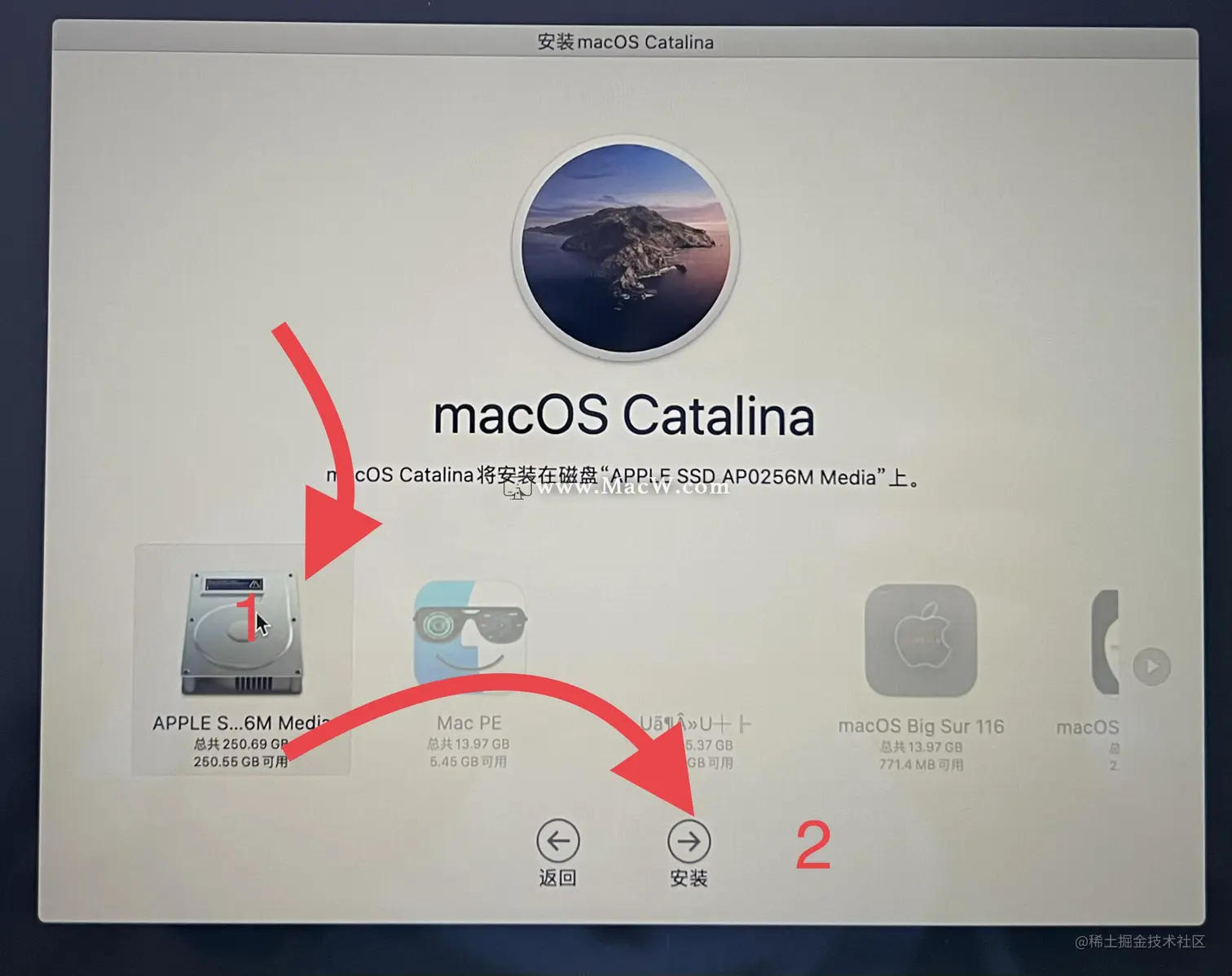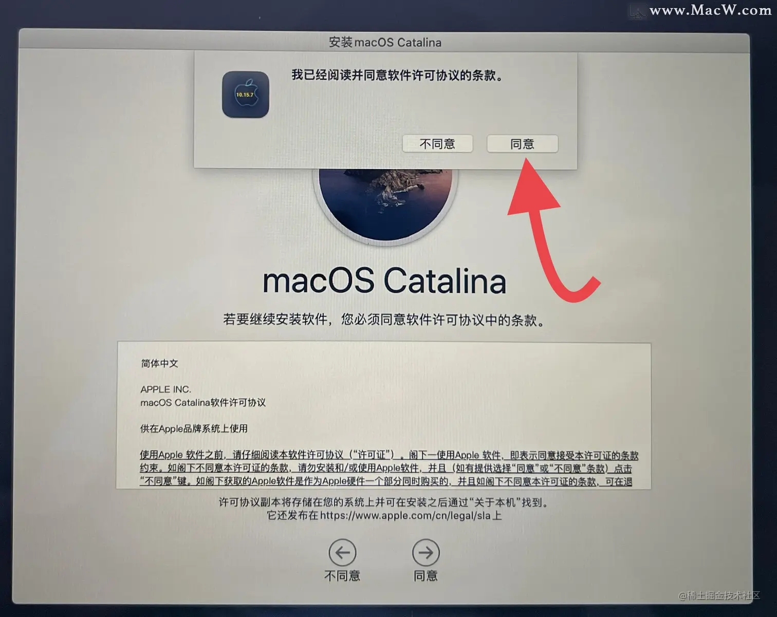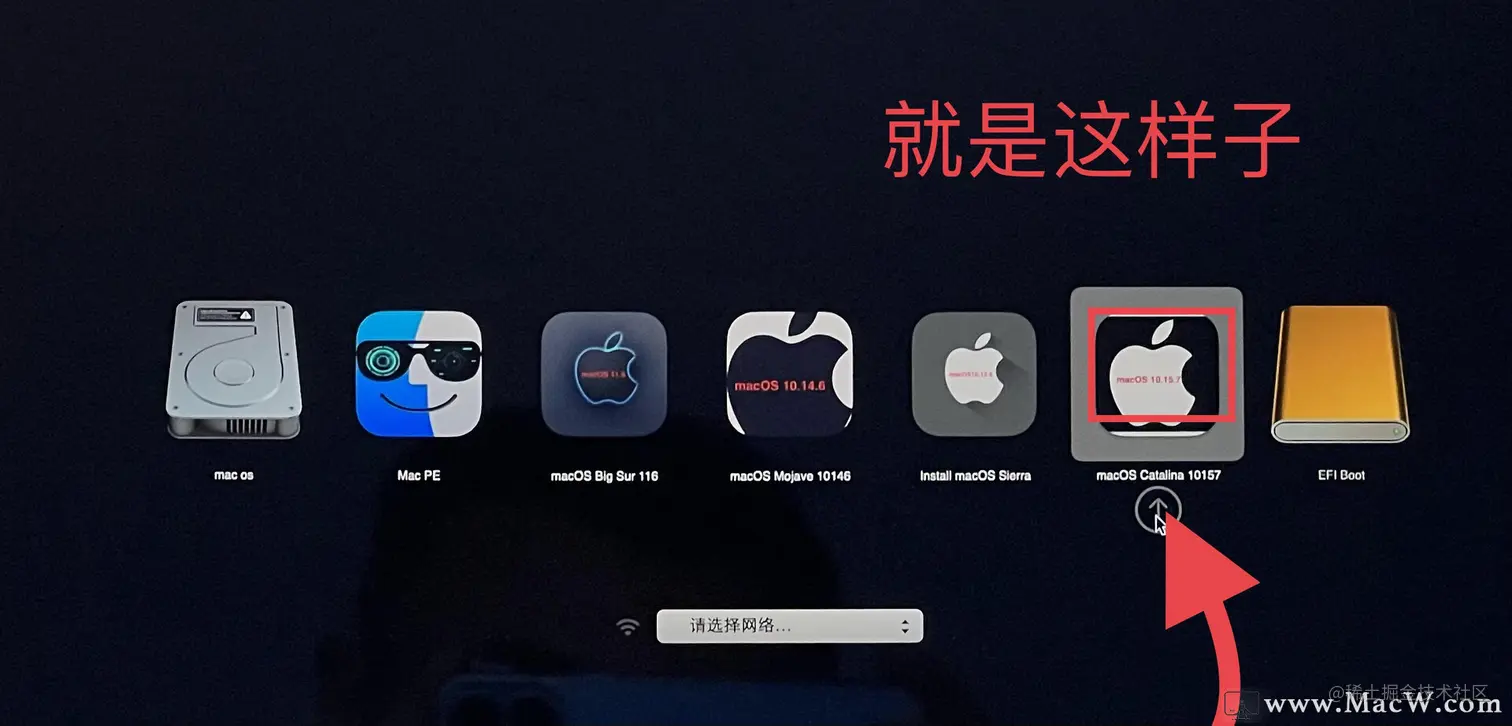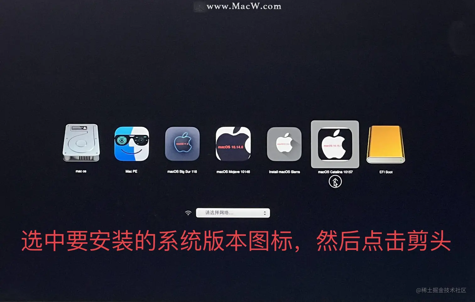 - 又来到一开始时的界面,点选要安装的系统版本,我这里选择10.15.7,然后点那个向上的箭头