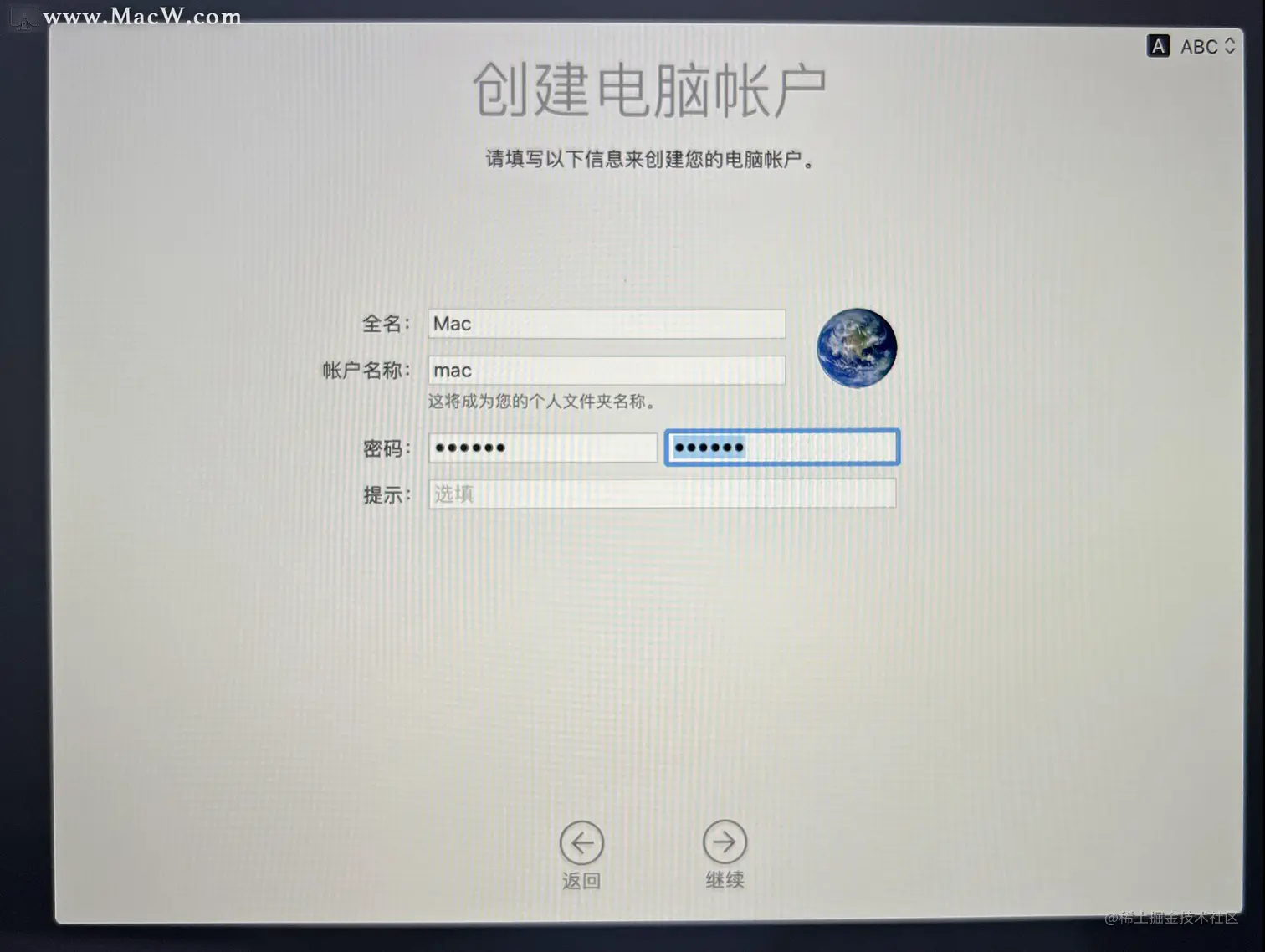 输入 用户名,我就输入 Mac 了,密码自己设定能记住的