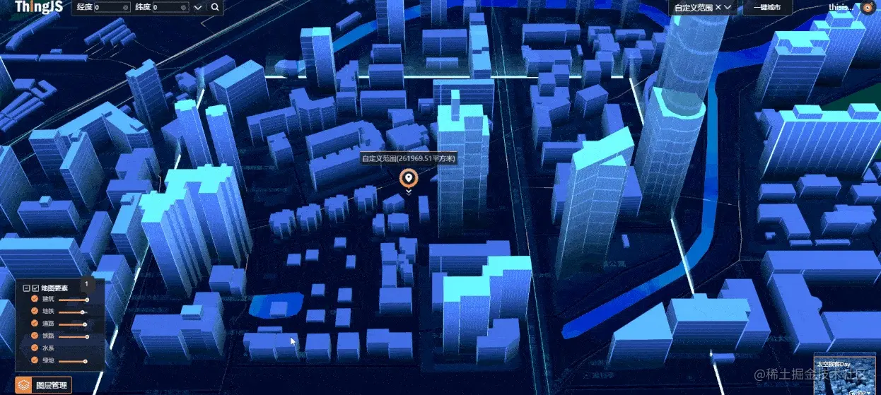 一键城市2.0(ThingMap)是ThingJS平台推出的在线3D城市模型场景快速生成系统,所生成的3D城市模型场景,可用于快速构建网页版3D城市类型的管理应用。无论是在大屏监控应用,还是PC端管理应用场合,都可满足应用需求。支持海量基础三维空间数据在不同尺度下的快速加载、渲染、显示,为智慧城市相关应用和企业提供便捷的三维地图沙盘服务。