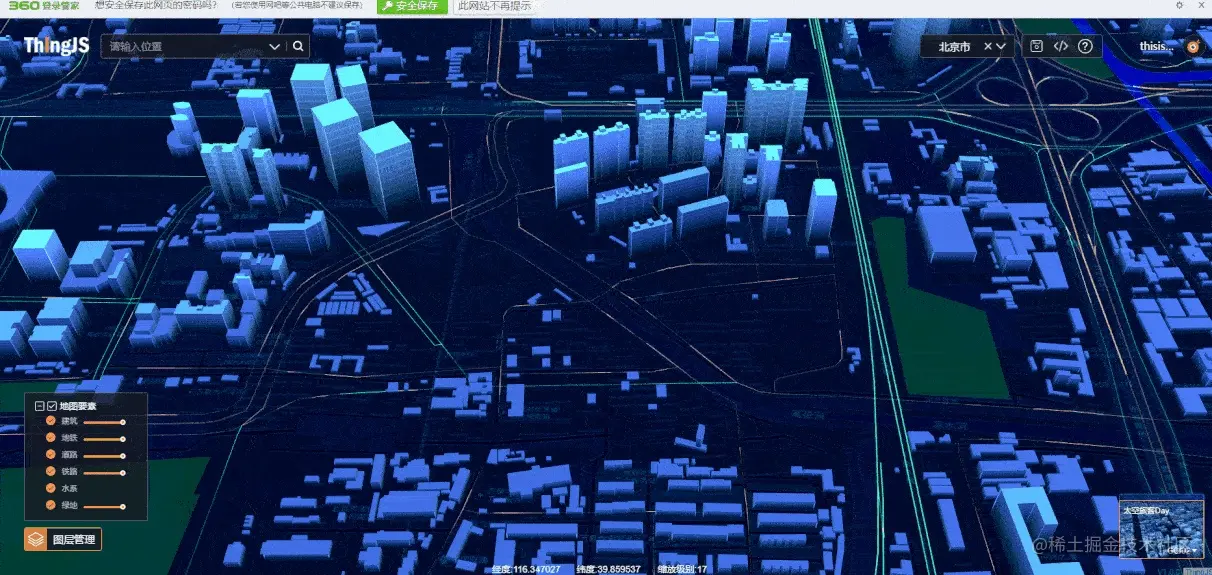 ThingJS拥有精模、地图效果、3D配饰等各种丰富的效果资源库和各种效果的生产能力,可以为ThingMap提供突出的可视化能力,提升三维地图可视化效果,使ThingMap相比其他地图服务更能满足城市级可视化应用的需求。