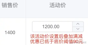 - 设置活动优惠价时,出现低于底价阈值的进行及时提醒。