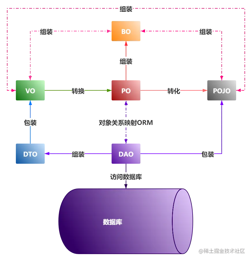 | DTO | 经过加工后的PO对象,其内部属性可能增加或减少 | Data Transfer Object数据传输对象,主要用于远程调用等需要大量传输数据的地方,例如,可以将一个或多个PO类的部分或全部属性封装为DTO进行传输 |