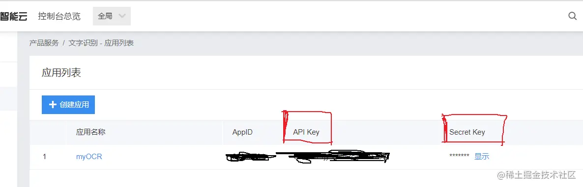 免费申请文字识别功能后,在控制台可以查看到API Key和Secret Key,由这两个参数可以获得access_token,它是调用API接口的必需参数(如下图红色方框所示)。
