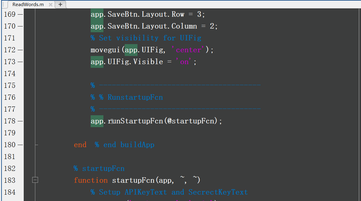 另外,app.runStartupFcn(@startupFcn);语句调用的是父类matlab.apps.AppBase的方法,我们将各个控件的注册任务放在startupFcn这个方法中完成。这里不妨先注释掉这个语句,直接运行ReadWords.m便可以显示出我们刚才在buildApp方法中构造的界面了,动图演示如下: