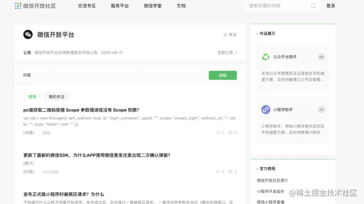微信开放平台的用户是开发者,而这类用户使用的高频、重点模块是平台能力的平台的接口文档、平台账户登录模块,而平台提供的微信开发者社区是基于平台下的产品能力作为UGC讨论的,辅助开放者平台的服务,同时承担了平台内容的传播。