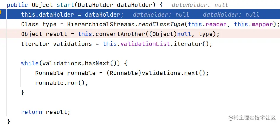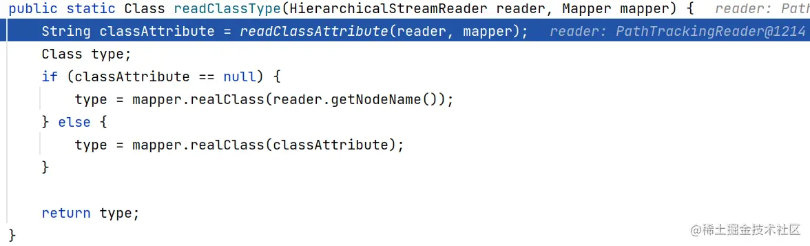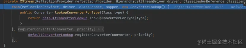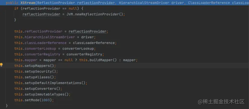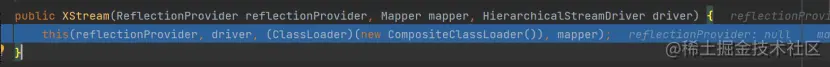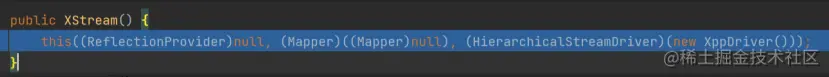 StepInto,很明显我们我们进入了XStream的无参构造方法中,在这个方法中,传递了默认的接口反射提供者(与其他框架的反序列化方式不同,XStream利用的是java的反射机制--也是为什么XStream不用限制javaBean类中setters、getters方法不用必须实现的原因;也是JavaBean类不用实现Serializeable接口,重写readObject()方法的确依然可以进行反序列化的原因)、Mapper映射器、以及解析器对象的创建(在默认的构造方法中,不难发现依赖的是自包含的XppDriver分层流驱动程序,也就是单纯的使用XMLPullParser()方法进行解析,并未依赖Xpp3类库的解析方法)