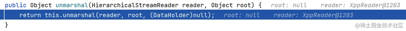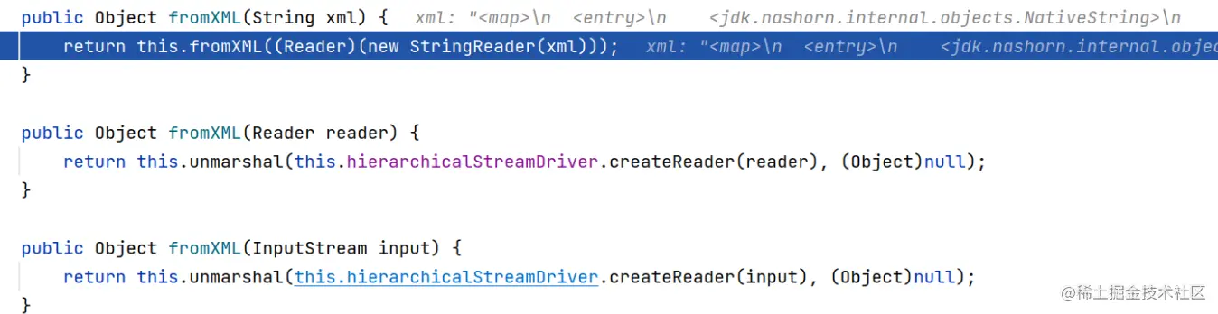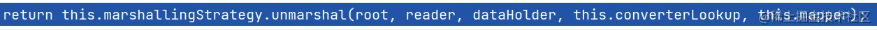 ①把String转化成StringReader,HierarchicalStreamDriver通过StringReader创建HierarchicalStreamReader,最后调用MarshallingStrategy的unmarshal方法开始解组