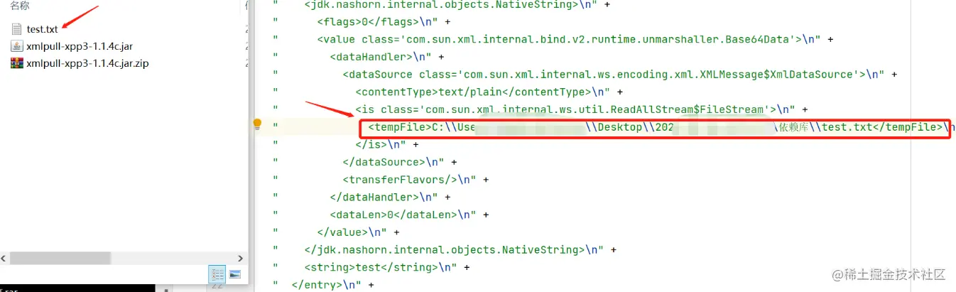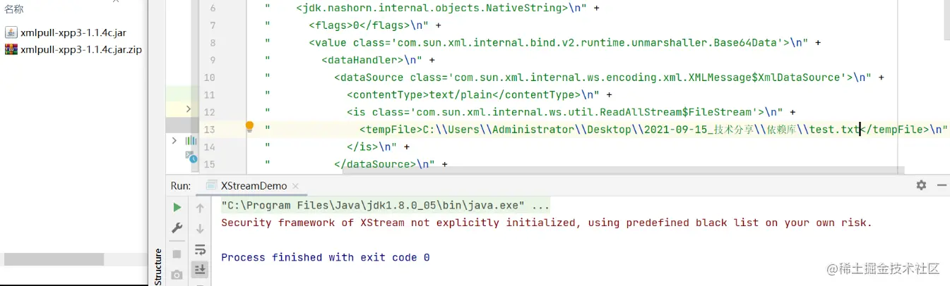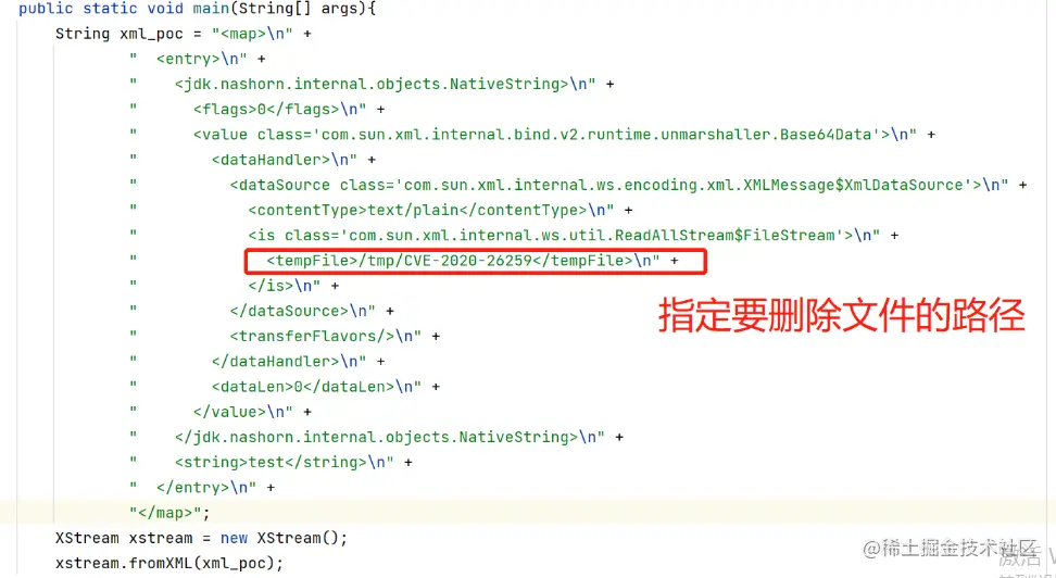然后,将CVE-2020-26259漏洞任意文件删除的POC写入到XML字符串中,调用XStream反序列化函数进行反序列化后,观察现象: