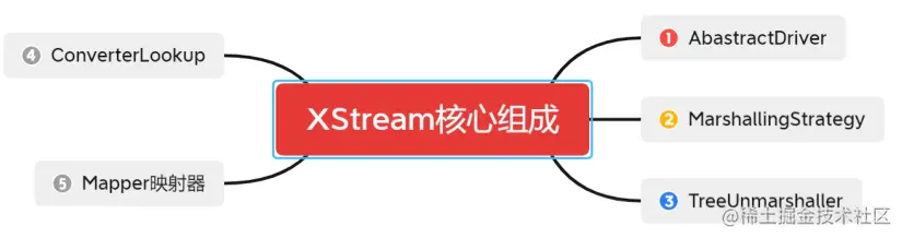XStream总体主要由上图所示的五个接口和抽象类组成。其中,