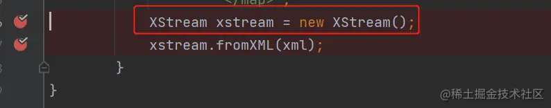 写一个简单的测试案例,并在创建XStream对象的位置下一个断点,然后开始debug,看看创建对象过程中XStream框架的调用链究竟是什么样的呢?