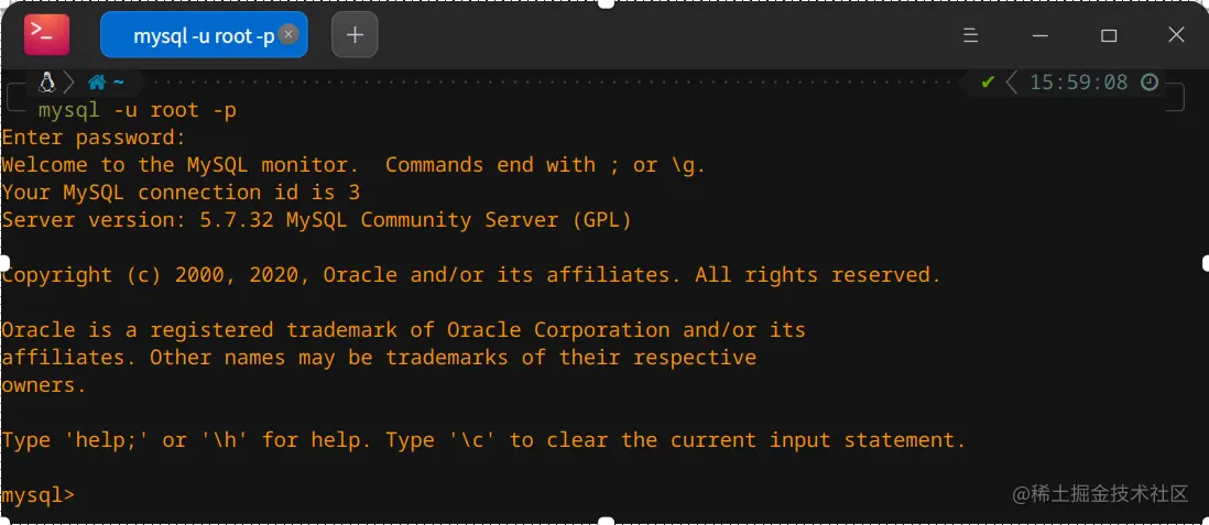 经过上述的步骤之后,我们的 MySQL 就安装好了,然后使用如下命令进入 MySQL 验证即可;