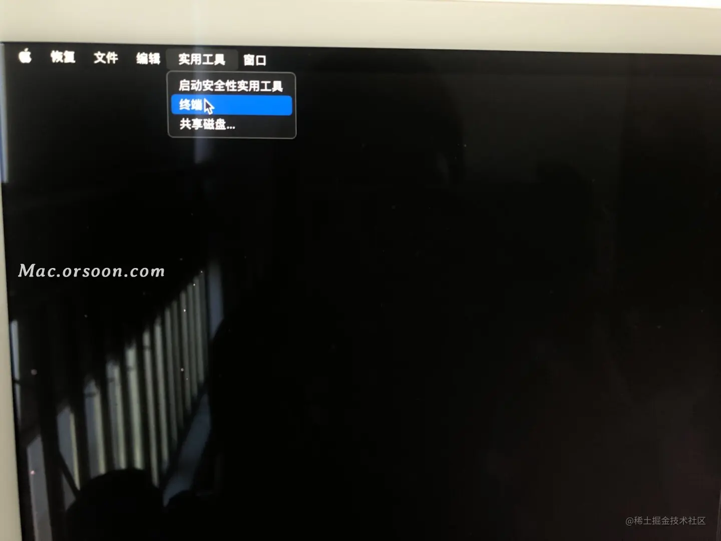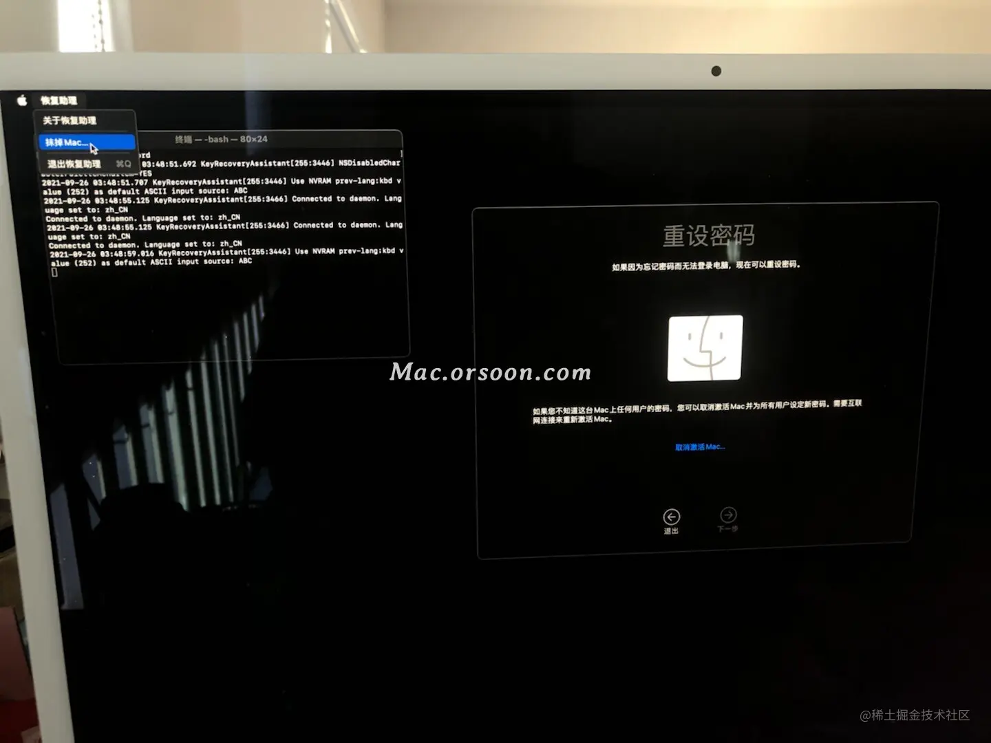 4、回车完成后,先点击【重设密码】窗口,以将它前置,然后从菜单栏中选取【恢复助理】【抹掉 Mac】,如图: