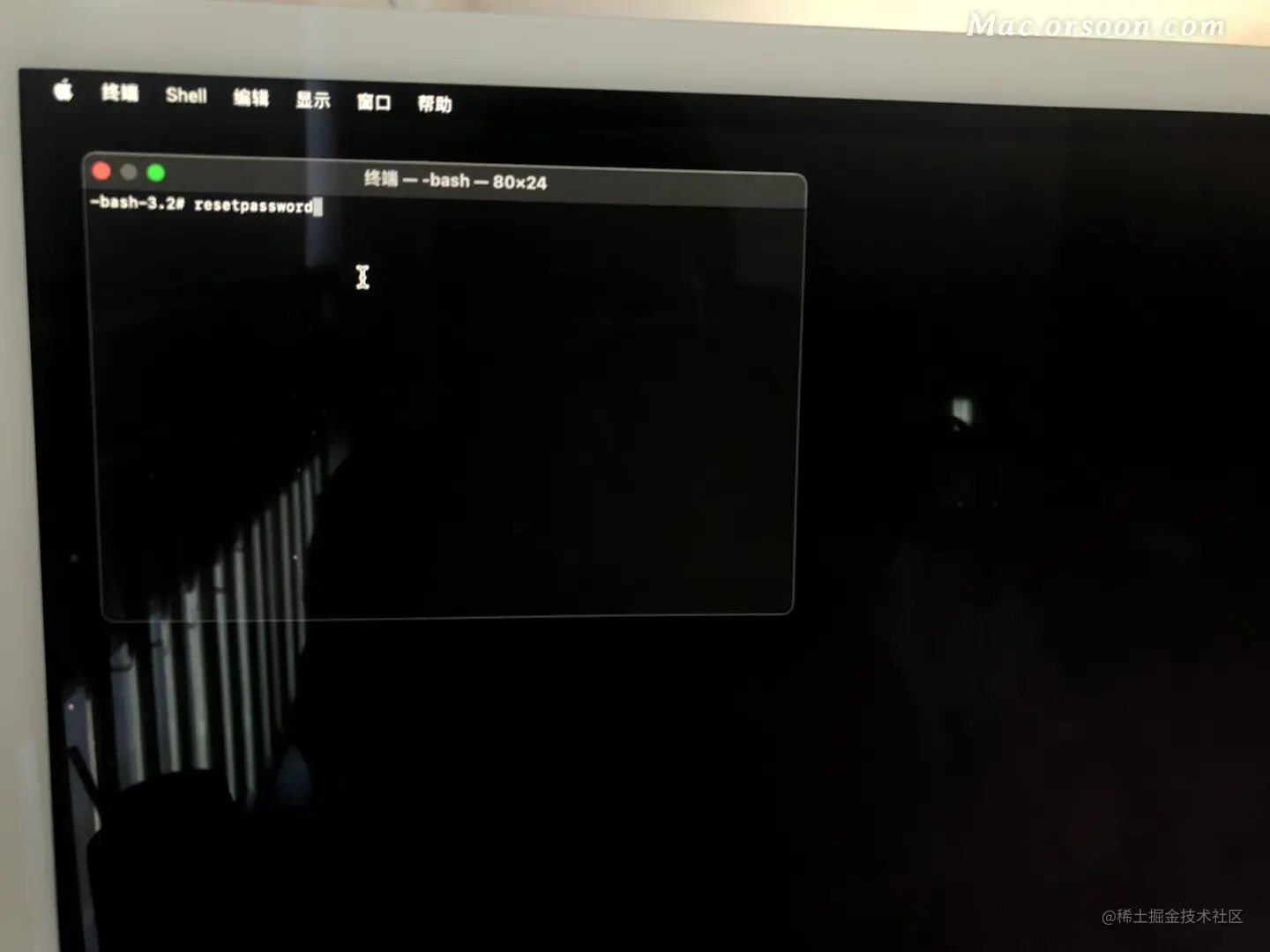 3、在【终端】内输入命令 【resetpassword】命令,然后点击Return回车键,如图: