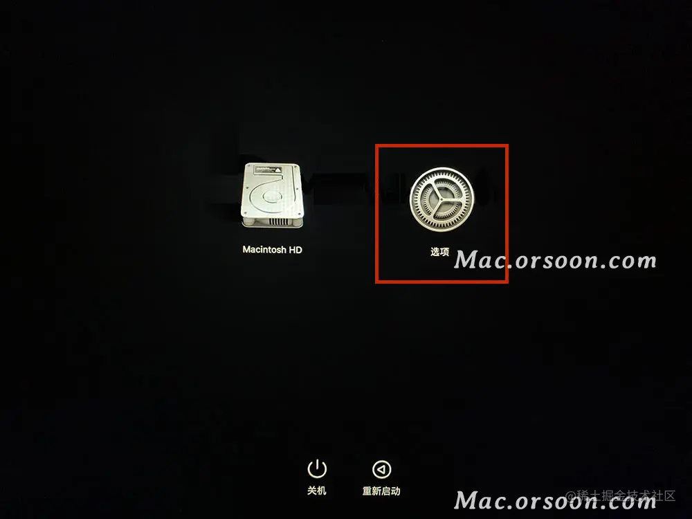 1、电脑关机后,重启Mac时不要放手,继续按住电源按钮,直至您看到启动选项窗口,选择【选项】,如图: