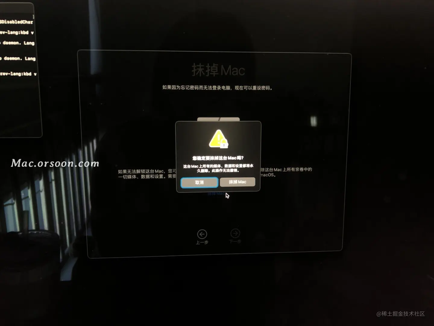 6、然后再次点击【抹掉 Mac】进行确认,然后您的 Mac 会自动重新启动,如图: