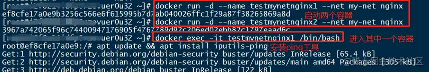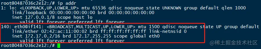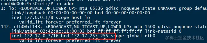 可以进入到容器看看IP分配情况,如果ip addr命令在容器内找不到,那是因为基础镜像只包含核心命令,如果要执行其他命令,需要额外安装。可以在容器内执行如下命令进行安装。