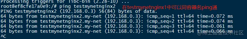 mynginx容器内能ping通mynginx2,那是因为两个容器之间共用了docker0,通过docker0进行转发。