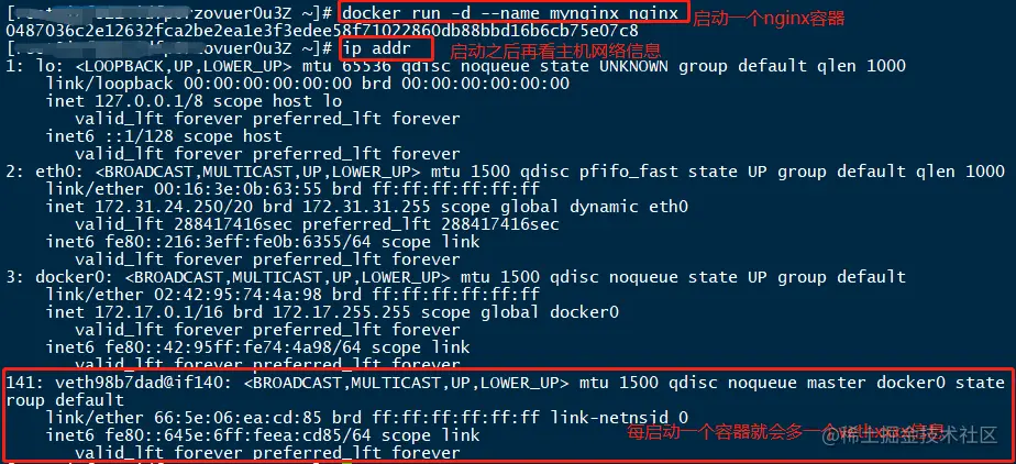 这里有没有发现容器内的IP是和主机多出来的虚拟网卡是成对出现,这样主机网络和容器之间肯定能通;