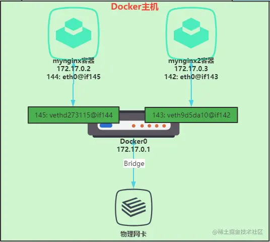 当启动容器时,Docker主机就会创建一对虚拟网卡vethpair设备接口,如下: