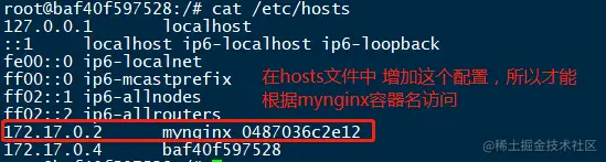 内部原理其实是在mynginx3内部做了个映射配置,容器mynginx3的hosts内容如下: