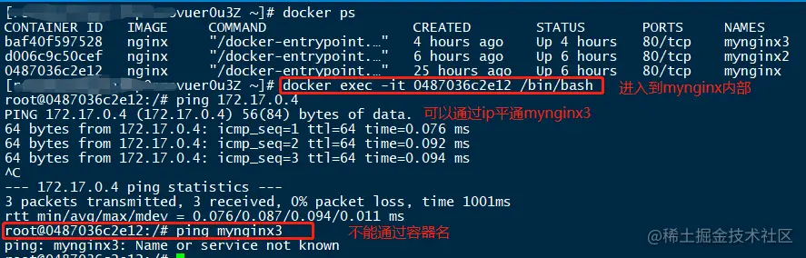 这样只能在容器mynginx3内部通过mynginx容器名ping通,不能在mynginx内部通过容器名mynginx3访问,如果要达到同样的效果,就得在启动mynginx时通过--link和mynginx3关联起来。