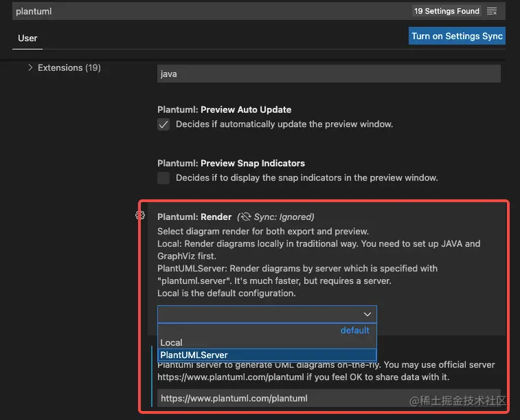 需要注意的是,PlantUML 的本地渲染依赖 Graphviz ,需要提前安装并配置环境变量。如果你使用 VSCode 插件,也可以借助云端渲染,只需要作如下配置: