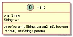 class定义后跟大括号,声明成员,然后按照 变量名:类型 的顺序声明,类型后置。方法和成员的顺序上可以混在一起,最终成图是,会自动分为两组