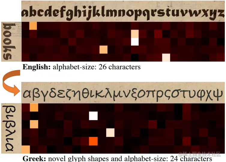 图1 用于文本识别的视觉匹配。当前的文本识别模型从预定义(固定)字母表中学习特定于字符形状(字形)的判别特征。我们训练我们的模型来建立给定字符字形(顶部)和要识别的文本行图像(左侧)之间的视觉相似性。这使得模型高度适应看不见的字形、新字母表(不同的语言),并且无需进一步训练即可扩展到新的字符类,例如英语→希腊语。更亮的颜色对应于更高的视觉相似性。