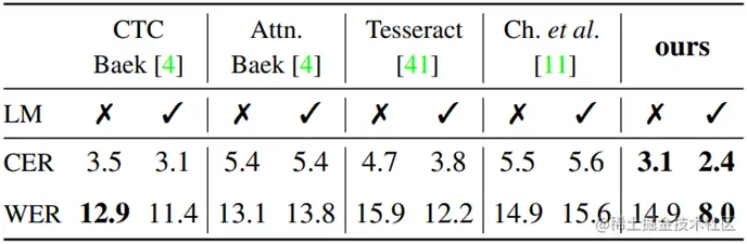 图4 VS-3:从合成数据到真实数据的推广。Google1000英文文档中仅在合成数据上训练模型的平均错误率(%;↓更好)。LM代表6-gram语言模型。