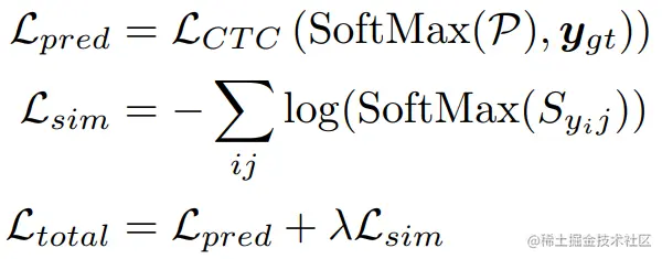 使用CTC损失监督字形示例P,以将预测与输出标签对齐。还在每个位置使用辅助交叉熵损失(L sim)来监督视觉编码器S的相似性映射输出。使用真实字符边界框来确定每个字符的空间跨度。总体训练由以下两部分损失组成。