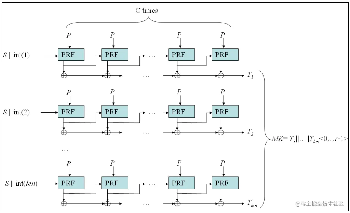 在上一节中,我们可以看到其实最后的衍生key是由好几部分组成的,上图中的每一个T都代表着衍生key的一部分,最后将这些T合并起来就得到了最终的衍生key,其公式如下: