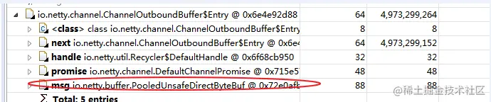 ChannelOutboundBuffer对象占将近5G内存,泄露原因基本可以确定:ChannelOutboundBuffer的entry数过多导致,查看ChannelOutboundBuffer的源码可以分析出,是ChannelOutboundBuffer中的数据。