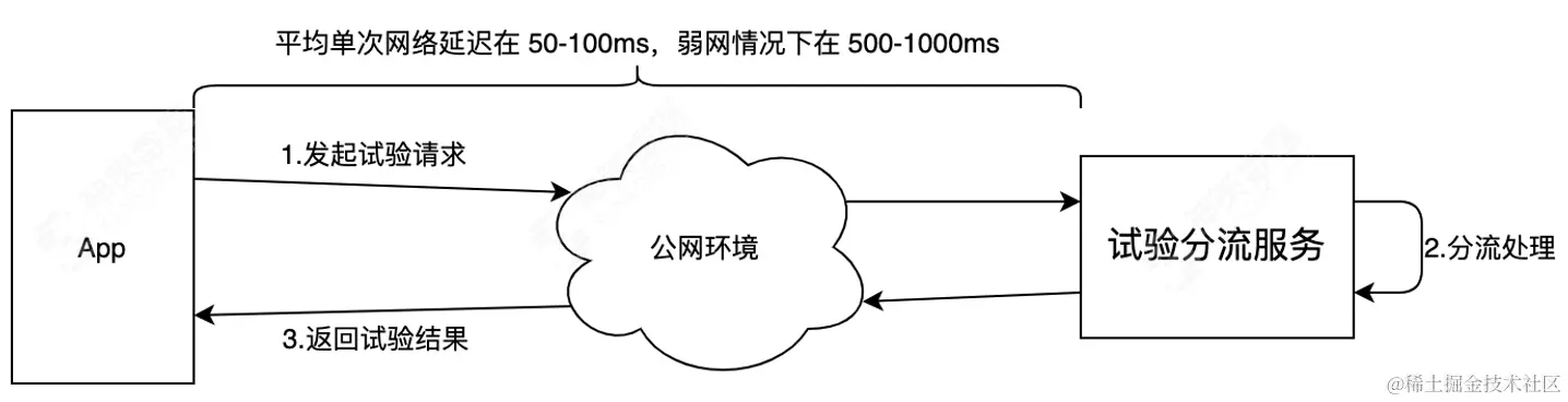 如上图所示,1 次 A/B 测试请求的耗时主要包含 2 次公网传输耗时和 1 次分流服务处理耗时,而公网传输耗时是 App 使用过程中不可避免会存在的。所以降低 A/B 测试延迟的根本在于降低分流服务的处理耗时和规避试验请求的公网传输耗时。