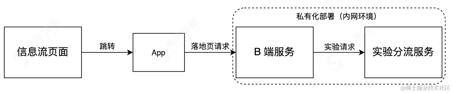 在部分特殊场景中,试验分流结果只能在首次加载时获取,无法预先被加载,例如投放落地页场景中用户从流量平台跳转到 B 端平台/App,因为用户信息无法提前获取到,导致在落地页加载之前必须实时发起一次试验请求。针对这部分特殊场景,可以考虑通过前文提到的私有化部署方案来规避。