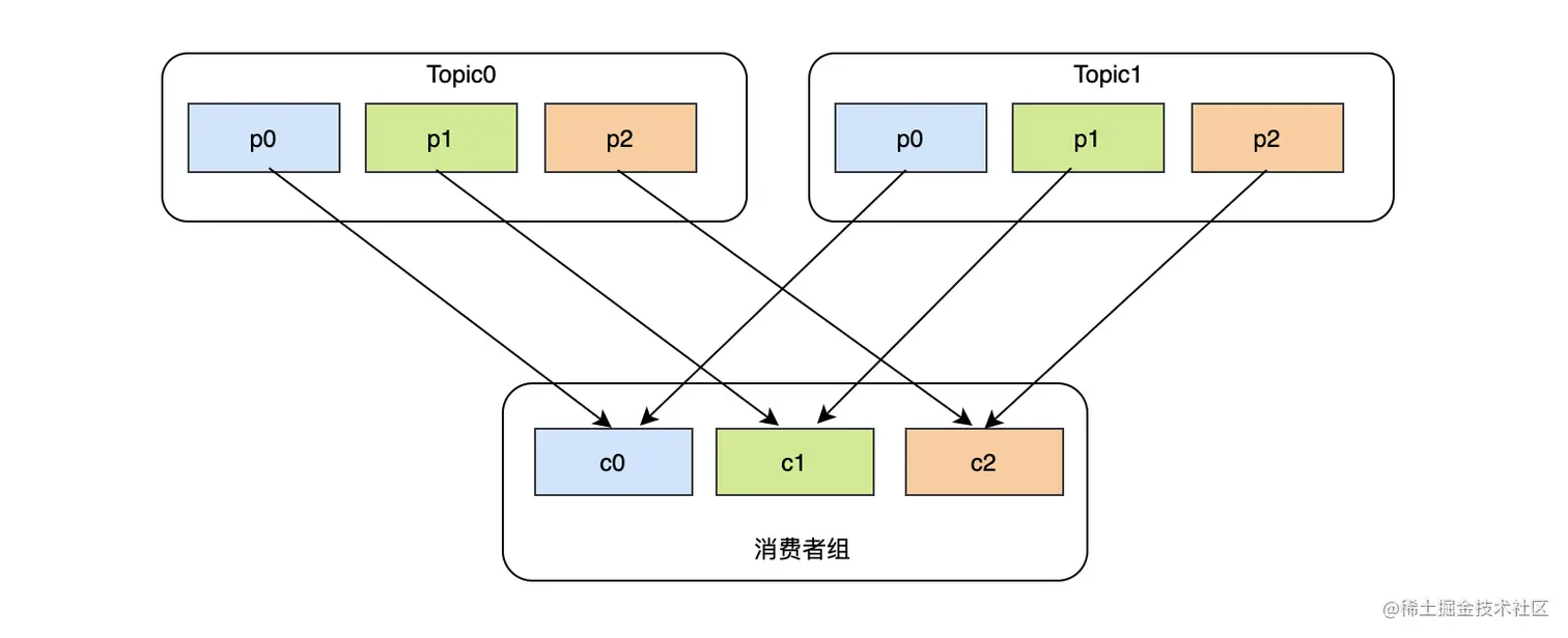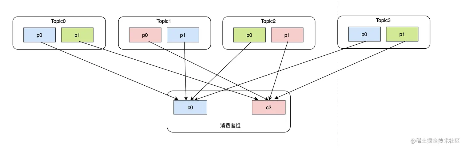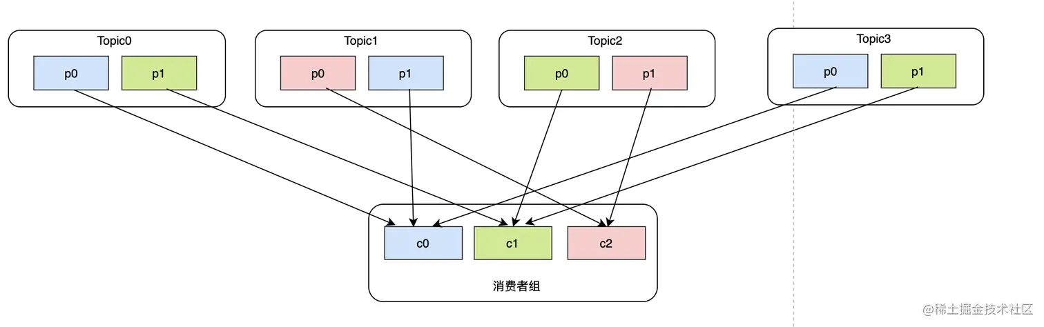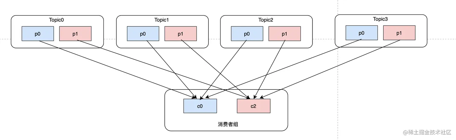 这么看来RoundRobin并不是最完美的,在不考虑每个topic分区吞吐能力的差异,可以看到c2的消费负担明显很大,完全可以将Topic1-p1分区分给消费者c1。