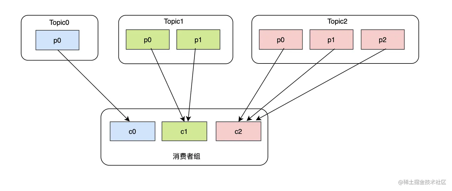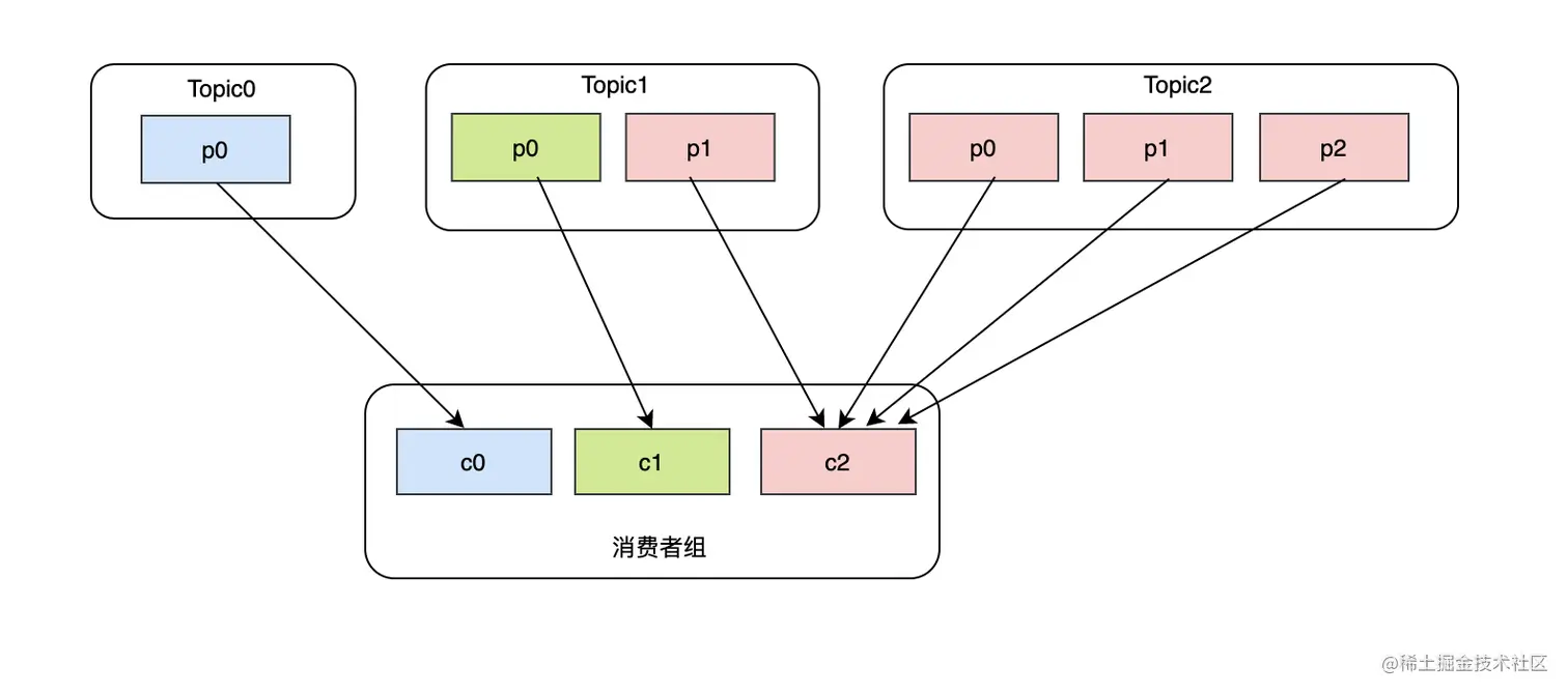 看似很完美,但是如果现在有3个topic,并且每个topic分区数是不一致的,比如topic0只有一个分区,topic1有两个分区,topic2有三个分区,而且消费者c0订阅了topic0,消费者c1订阅了topic0和topic1,消费者c2订阅了topic0、topic1、topic2,那么大致消费状况是这样的: