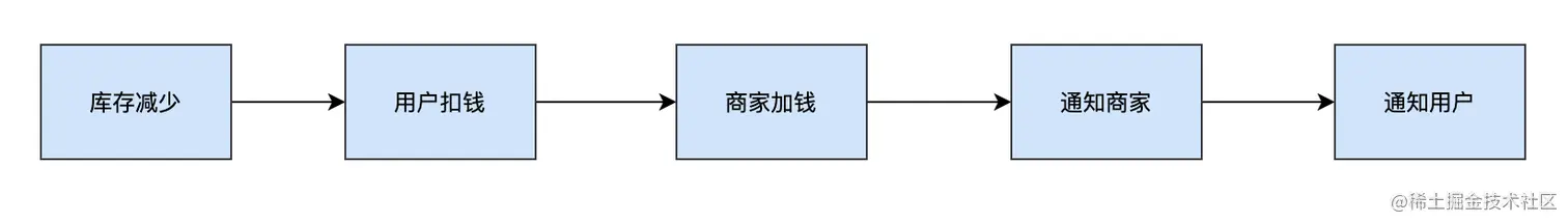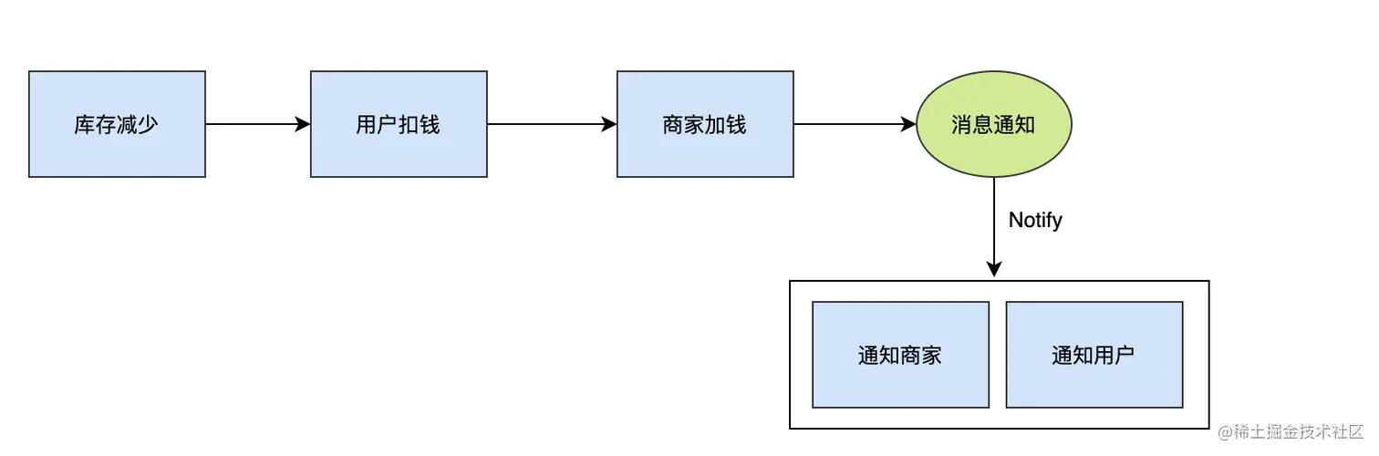 这整个下单过程,如果全部同步阻塞,那么耗时会增加,用户等待的时间会加长,体验不太好,同时下单过程依赖的链路越长,风险越大。为了加快响应,减少风险,我们可以把一些非必须卡在主链路中的业务拆解出去,让它们和主业务解耦。下单的最关键核心就是要保证库存、用户支付、商家打款的一致性,消息的通知完全可以走异步。这样整个下单过程不会因为通知商家或者通知用户阻塞而阻塞,也不会因为它们失败而提示订单失败。