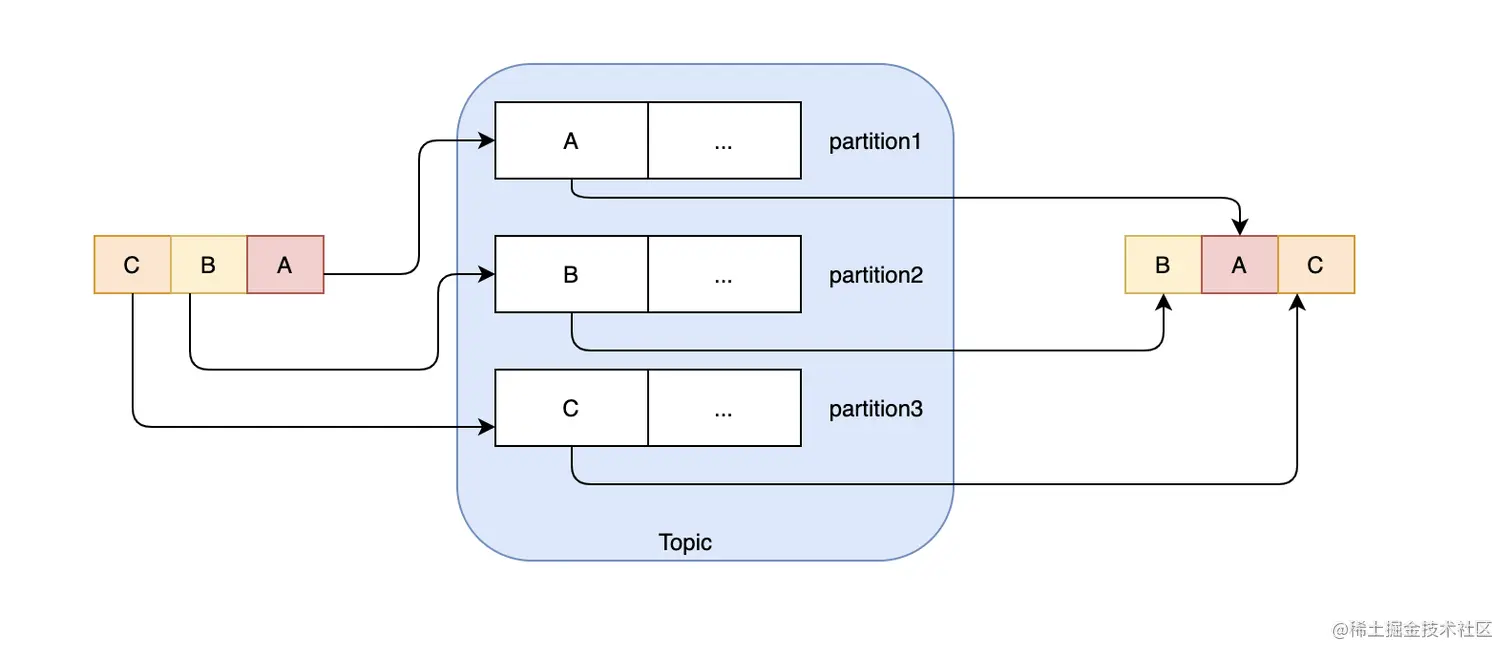 kafka支持轮询法,即在多分区的情况下,通过轮询可以均匀地把消息分给每个分区,这里需要注意的是,每个分区里的数据是有序的,但是整体的数据是无法保证顺序的,如果你的业务强依赖消息的顺序,那么就要慎重考虑这种方案,比如生产者依次发了A、B、C三个消息,它们分别分布在3个分区中,那么有可能出现的消费顺序是B、A、C。