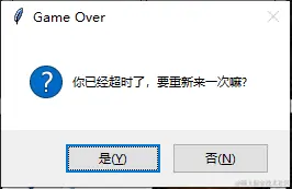 is_restart = messagebox.askyesno('Game Over', '你已经超时了,要重新来一次嘛?')