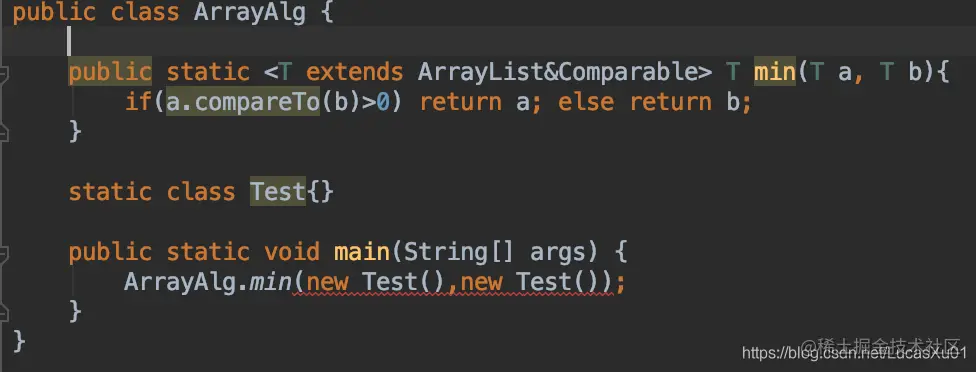 如果这个时候,我们试图传入一个没有实现接口Comparable的类的实例,将会发生编译错误。