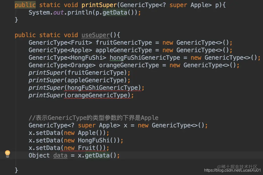 但是对泛型类GenericType来说,如果其中提供了get和set类型参数变量的方法的话,set方法可以被调用的,且能传入的参数只能是X或者X的子类。