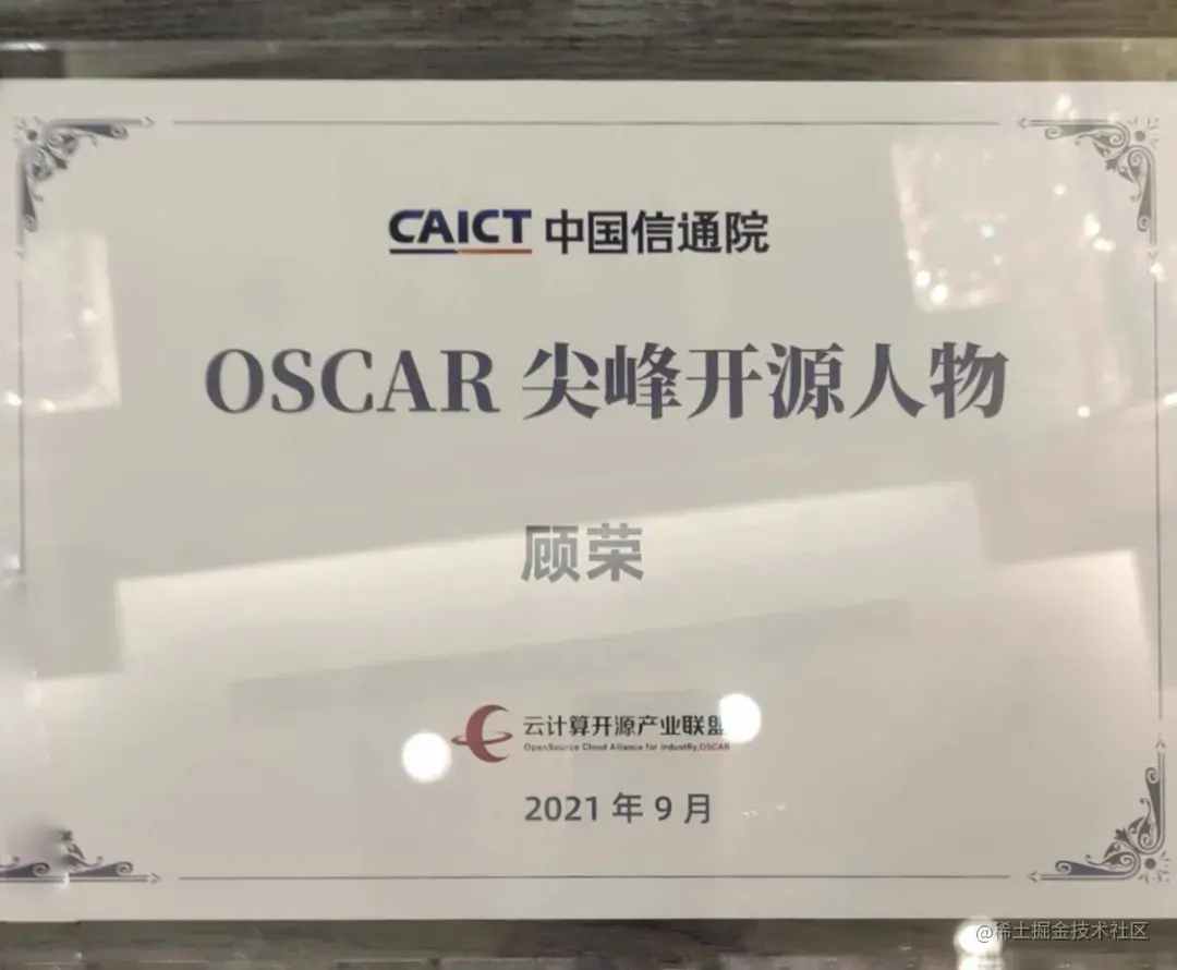 2021 年 9 月 17 日,在由中国信息通信研究院、中国通信标准化协会联合主办的“2021 OSCAR 开源产业大会”上,由阿里云云原生团队联合发起(其他联合单位包括:南京大学、Alluxio 社区)的开源项目 Fluid 荣获“ OSCAR 尖峰开源项目和开源社区”奖项;同时,作为 Fluid 项目的联合发起人和社区运营主席,来自南京大学 PASALab 的顾荣副研究员被评选为“开源人物”。
