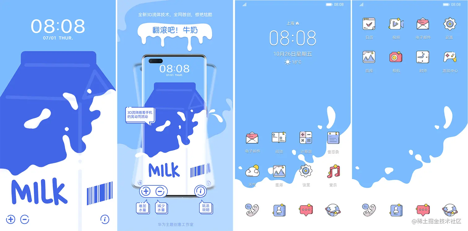 “翻滚吧牛奶”主题是华为主题创意工作室倾力打造的真实3D流体主题,模拟真实的液体流动,惊艳炫酷。在趣味性的背后,是HMS Core开放能力的加持,通过华为图形引擎服务(Scene Kit),运用全新的3D流体技术,让趣味艺术跃然于屏幕之上。