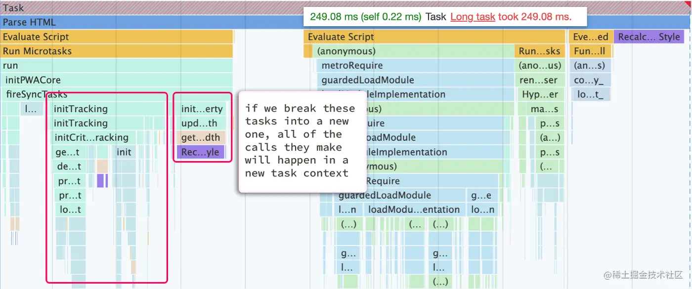 可以看到,这是个执行了249.08ms的长任务,在执行期间浏览器会掉帧(表现为:浏览器卡顿)。