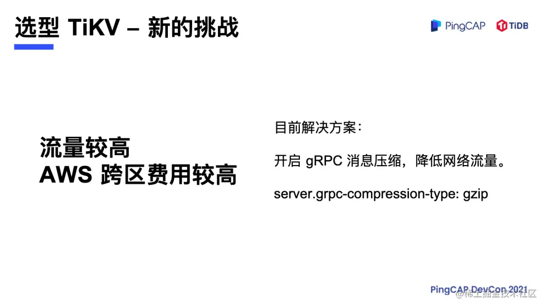 但是我们没有高兴多久就遇到了新的挑战,因为 AWS 部署的时候是三个可用区的部署,比如法兰克福一部署就是 ABC 三个区域,三个副本之间通讯是要消耗流量,而流量是要收费的,而且涂鸦所有的应用也是部署在三个区,也需要跨区域的调用,TiKV 并没有像 Double 那样同区调用的策略,所以这个费用的成本居高不下,尽管涂鸦只有以前四分之一的机器,但是成本比原本还高。目前进行的解决方案是进行了基于 RPC 的压缩,降低网络的流量,但这种流量只能解决 Region 复制的流量,应用代码跨区的复制流量还是没有降下来。我们发现出现这种问题的原因是因为 TiKV 的服务端没有进行服务端过滤,需要把 TiKV 存储的数据取回到本地进行应用程序的过滤,然后再塞回去,这个跟 TiKV 的研发团队进行了沟通,后续的版本可能会推出****基于服务端的过滤,降低服务器的负载,流量成本也可能会下降。