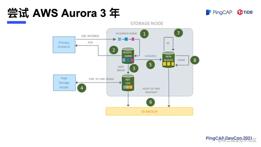 涂鸦在早期使用的是 AWS Aurora。Aurora 跟阿里云的 PolarDB 类似,是存算分离的架构,涂鸦在 Aurora 上稳定运行了三年,在前三年使用中 Aurora 完全满足需求。物联网在六七年前还比较冷门,智能家居设备没有这么普及,用户用的不多,但后来随着业务的扩展,近几年设备呈指数级的成长,每年都要翻三到五倍,Aurora 就无法承受暴增的数据量,特别是物联网响应时间要求是 10 毫秒以内,即使进行分库分表,拆散集群也达不到涂鸦的业务需求。