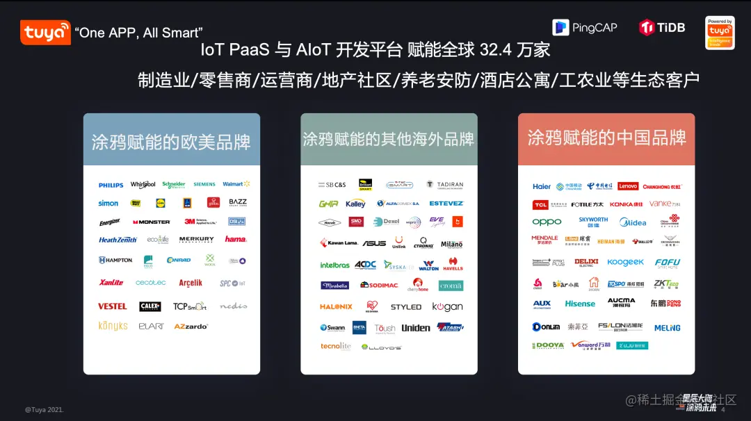 目前涂鸦在国内外已经有超过十万家的合作伙伴,在 IoT PaaS 和 IoT 的开发者平台的生态客户数量已经达到 32 万 +,其涉及到制造业、零售业、运营商、地产、养老、酒店(PaaS)等。涂鸦赋能的有欧美品牌和中国品牌,包括飞利浦,国内的海尔以及三大运营商。